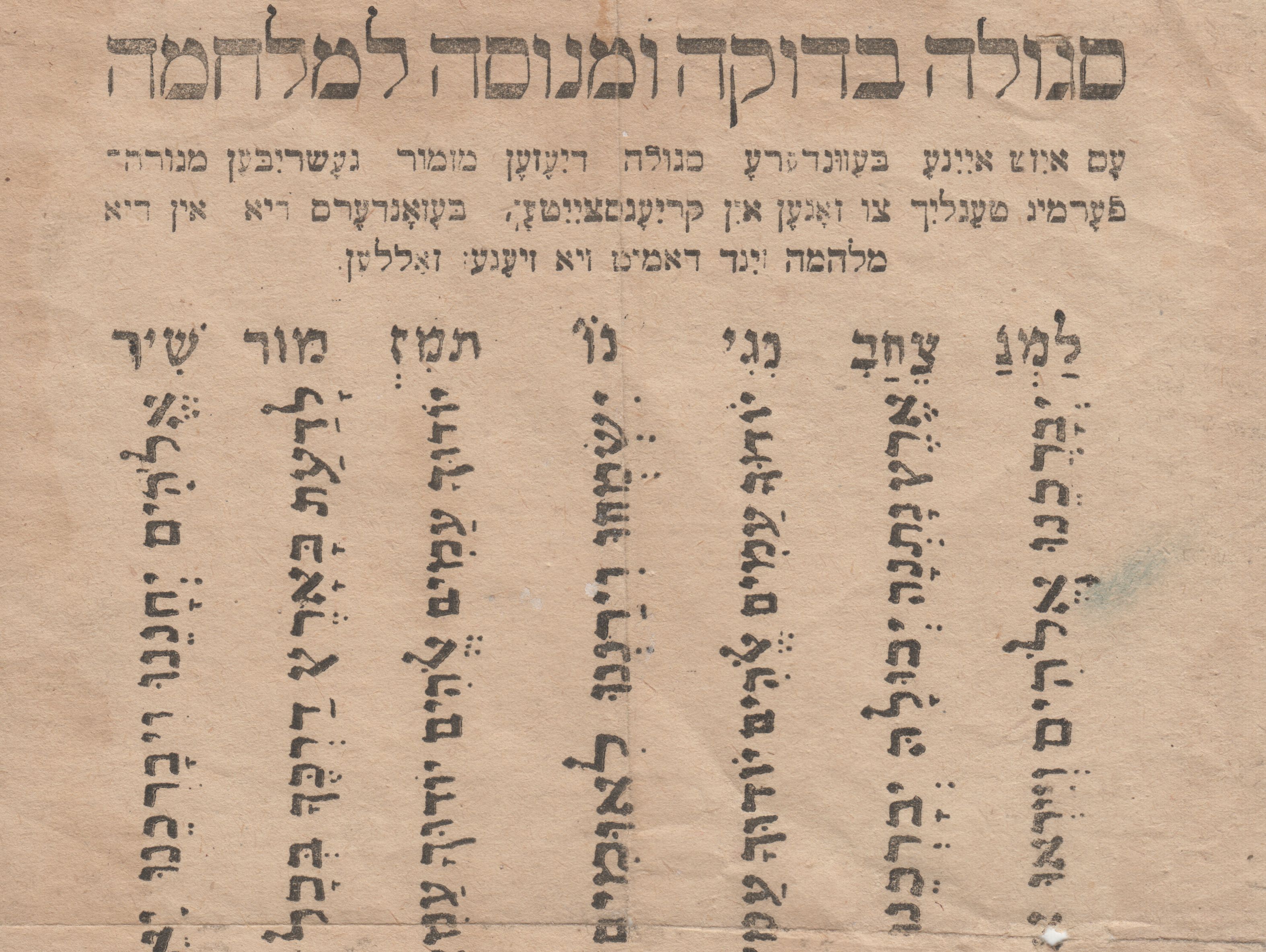 The holdings consist of pamphlets, journals, books, prints, postcards, letters, and other documents that reflect the participation of and support for Jewish soldiers in armies around the world from 1814 through the mid-20th century. The collection includes tiny prayer books that were produced for Jewish soldiers fighting in the Crimean War, the Indian Mutiny, the Boer War, and World War I, suitable for being secretly carried in small pockets of their uniforms. The journals highlight the contributions of Jewish soldiers to international military efforts. One photographic card shows soldiers participating in the seder night, dressed in German uniforms. Remarkable prints reflect artists’ impressions of Yom Kippur prayers during the Franco-Prussian War. The material in this collection is rare and has not been published to date.